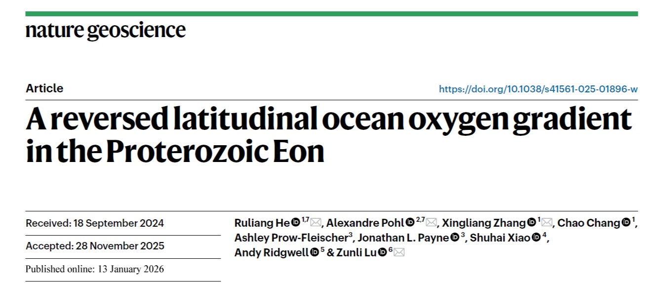 近日,伟德官网早期生命与环境研究团队在《自然·地球科学》(Nature Geoscience)发表了题为“A reversed latitudinal ocean oxygen gradient in the Proterozoic Eon”的研究论文。该研究通过对过去20亿年以来I/Ca地球化学指标的古纬度分布,发现了元古宙海洋的氧气含量由赤道附近向中高纬度降低,氧气分布受产氧光合作用主导,是“氧气绿洲”式氧化模型;而显生宙海洋的氧气含量由赤道附近向中高纬度增加,氧气分布受海水温度与有...