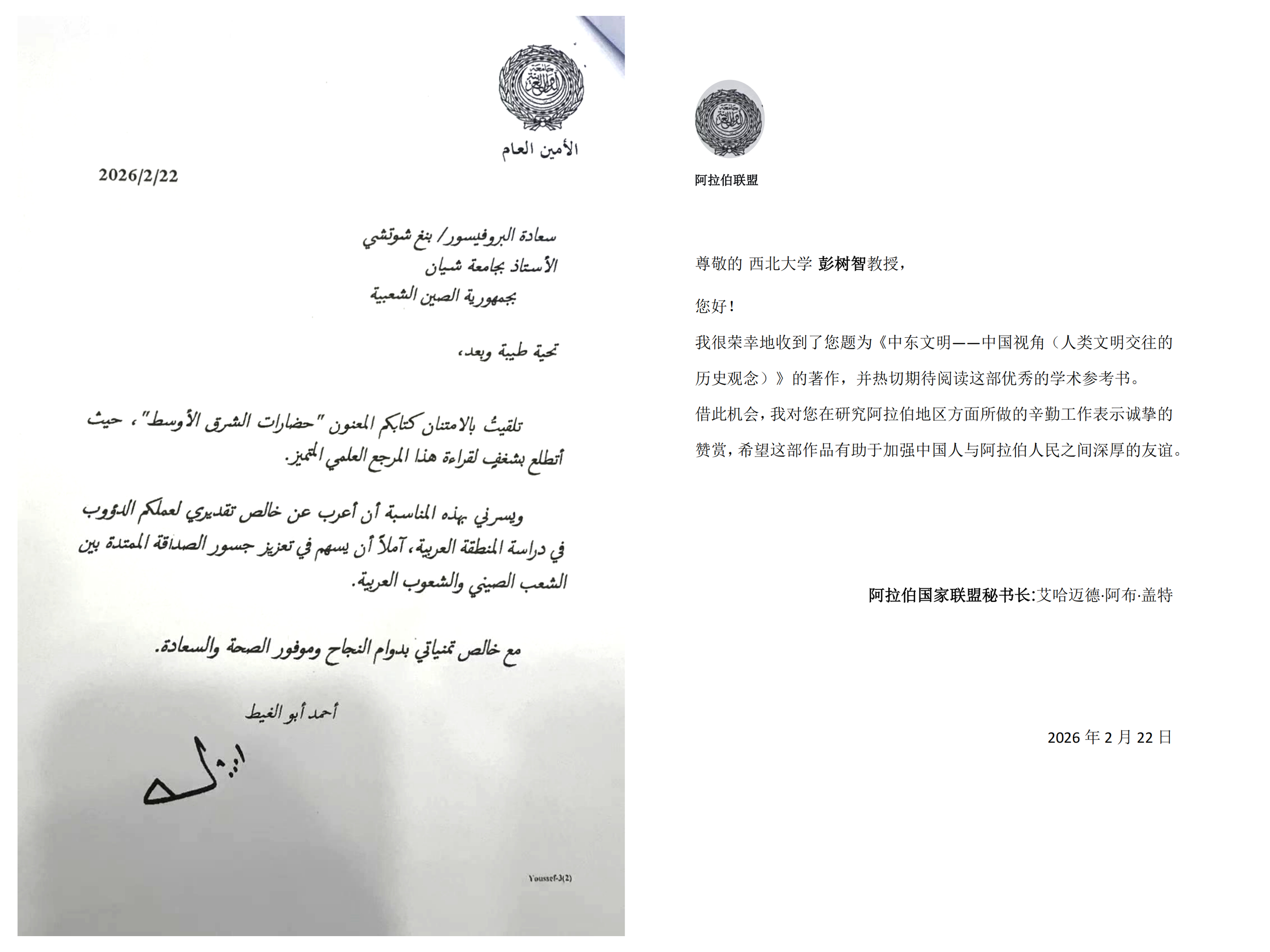 2月22日,阿拉伯国家联盟秘书长盖特致信伟德官网中东研究所名誉所长彭树智教授。盖特对彭树智教授在阿拉伯地区研究方面做出的辛勤工作表示诚挚的赞赏,希望《中东文明——中国视角(人类文明交往的历史观念)》(阿拉伯语版)有助于加强中国人与阿拉伯人民之间深厚的友谊。2022年,《人类文明交往的历史观念》由伟德国际1946源于英国出版社出版,系“伟德国际1946源于英国名师大家学术文库”丛书之一,荣获陕西省第十七次哲学社会科学优秀成果一等奖。彭树智...