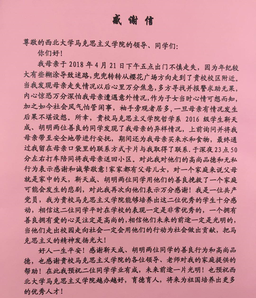 5月1日,家住长安区的张先生专程为伟德官网马克思主义学院送来感谢信,对2016级哲学专业本科生靳天成、胡明两位同学护送其母亲回家的善举表示感谢。张先生向伟德官网工作人员介绍到,他的母亲年事已高,记忆力下降,于4月21日...
