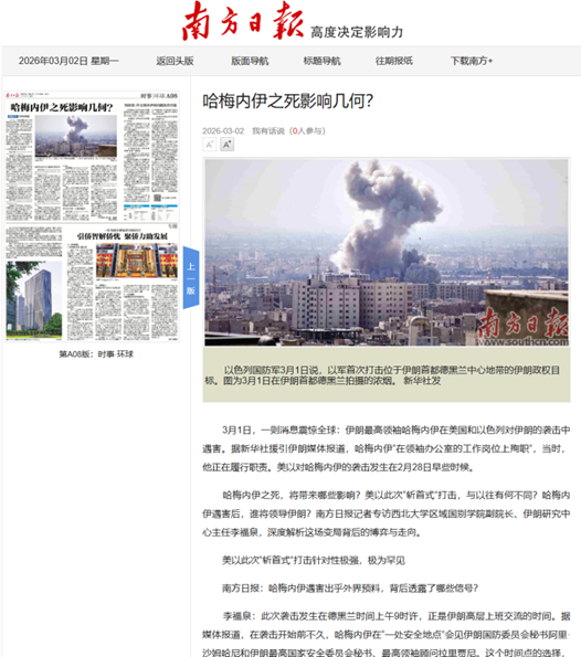 当地时间2月28日,美国和以色列对伊朗发动了大规模军事打击。3月1日,伊朗方面宣布最高领袖哈梅内伊在美以军事行动中丧生,这一被媒体称为“世纪斩首”的事件震惊世界。面对这一可能改写中东地缘政治格局的重大事件,区域国别学院副院长、中东研究所副所长、伊朗研究中心主任李福泉教授,副院长闫伟教授第一时间接受中国新闻社、《南方日报》等权威媒体专访,马韬(Matteo Capasso)教授接受CGTN采访。王晋教授在《光明日报》发表文章《美以对伊动武,中东危机加剧》,黄民兴教授在个人哔哩哔哩网站的“黄民兴聊中东”发布解读视频。博士研究生李炫璇作为特约记者在《环球时报》撰写评论文章。