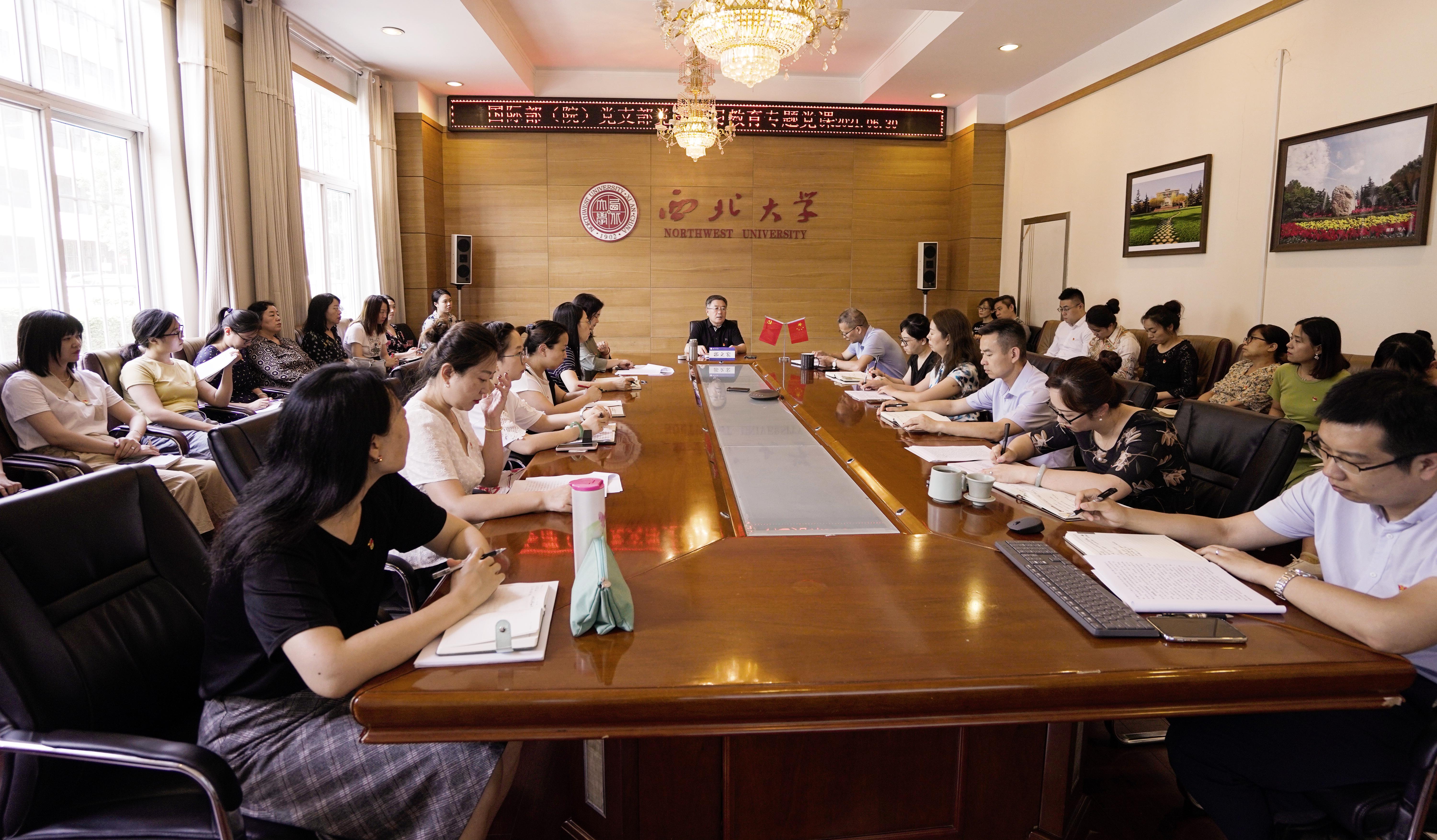 6月30日, 校党委副书记、校长郭立宏以“擘画新时代伟德官网国际化新蓝图”为题,为国际合作部(院)党支部讲了党史学习教育专题党课。国际部(院)全体教职工参加党课。