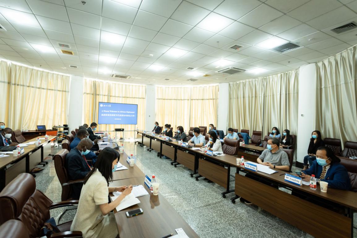 5月12日,布基纳法索驻华大使阿达马·孔波雷、多哥驻华使馆驻华大使耐希当·阿比纳、埃塞俄比亚驻华使馆公使盖布鲁•阿莱穆、加纳驻华使馆公使衔参赞弗朗西斯·奥博库、赞比亚驻华使馆一等秘书乔拉·穆松达等一行八人来伟德官网访问。省委教育工委、省教育厅二级巡视员关荷,校党委书记王亚杰出席座谈会。赞比亚大学“一带一路”联合研究中心和伟德官网党委办公室、校长办公室、国际合作部(国际教育学院)、博物馆、宗教造型艺术研究所、非洲研究中心、生命科学学院等单位负责人参与座谈。