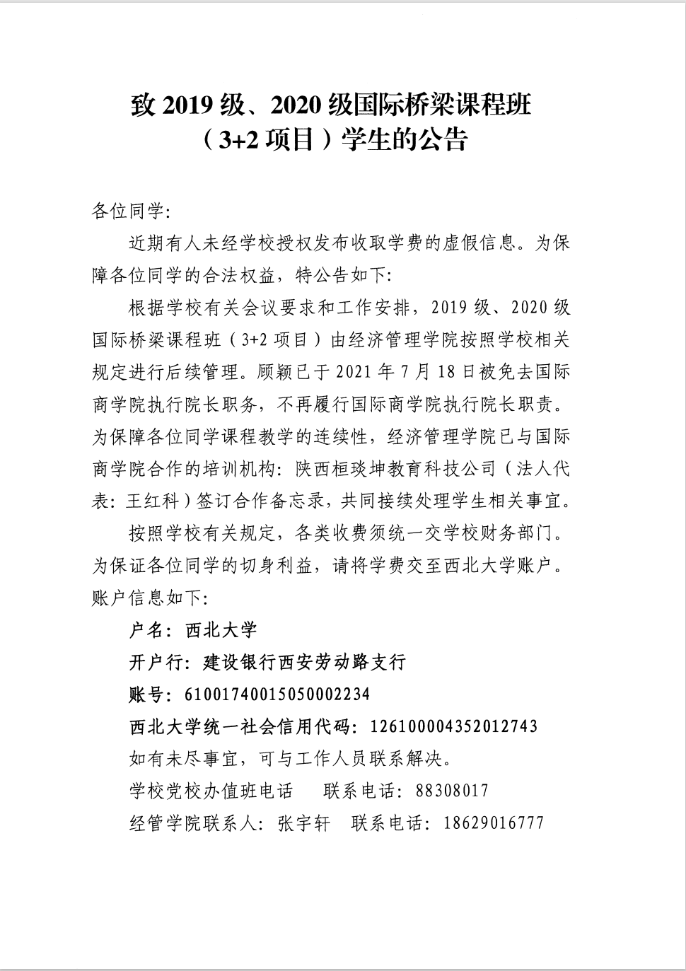 致2019级、2020级国际桥梁课程班(3+2项目)学生的公告