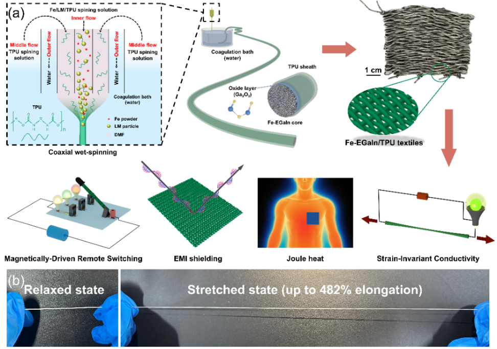 近日,伟德官网化工学院范代娣教授、李若松副教授团队联合复旦大学等单位,围绕柔性可穿戴电子在大形变条件下面临的导电衰减等难题,提出并构筑了一种同轴湿法纺丝结合冻压活化的液态金属纤维策略。团队构建了Fe-EGaIn/TPU核-壳液态金属纤维及其织物平台,实现高导电与超高延展,并具备应变不敏感导电,同时在织物形态下获得吸收占优的电磁屏蔽能力。此外,依托低电压可控焦耳热与红外热信号抑制,该织物可面向生物与可穿戴应用拓展:用于贴肤热管理/热疗与康复护理织物、可穿戴生理传感系统的稳定互连与布线层、医院/临床电磁环境下的个体防护及设备柔性屏蔽外罩,并为手术室或隔离病房等场景的无接触交互与指示控制提供材料基础。
