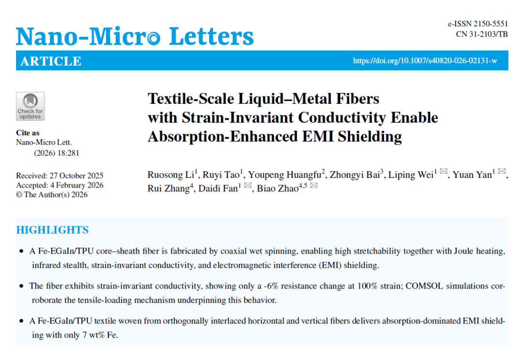 该纤维织物平台兼具高延展、导电稳定与多功能集成的优势,为下一代智能可穿戴防护材料与柔性电子器件开发提供了新思路。未来可望拓展至更多液态金属体系及织构化器件设计,实现电磁防护、热管理与人机交互等功能在复杂服役环境下的协同升级。该成果以“Textile-Scale Liquid-Metal Fibers with Strain-Invariant Conductivity Enable Absorption-Enhanced EMI Shielding” 为题发表在Nano-Micro Letters期刊上。