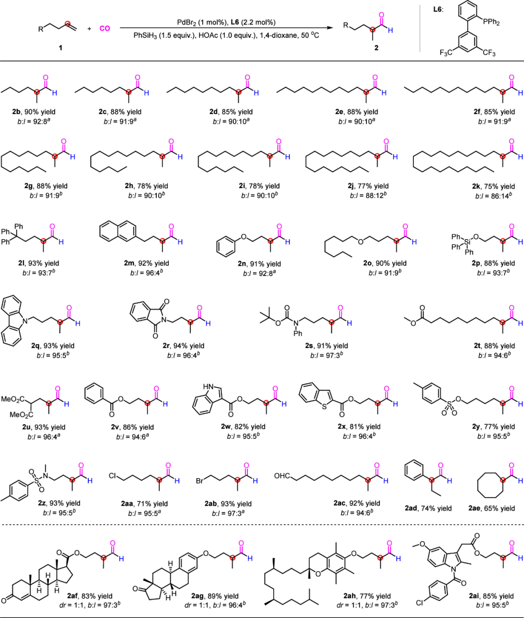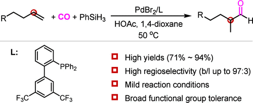 近日,伟德官网羰基化合成研究团队构建了一种钯催化烯烃的马氏氢甲酰化反应,成功突破传统烯烃氢甲酰化反应的区域选择性限制,实现了支链醛的高效合成。