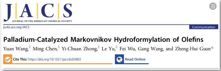 该成果以" Palladium-Catalyzed Markovnikov Hydroformylation of Olefins”为题发表在《美国化学会志》(JACS)上,伟德国际1946源于英国毕业硕士生王圆、副教授陈明、博士生钟绎川和副教授于乐为论文共同第一作者,通讯作者为关正辉教授。