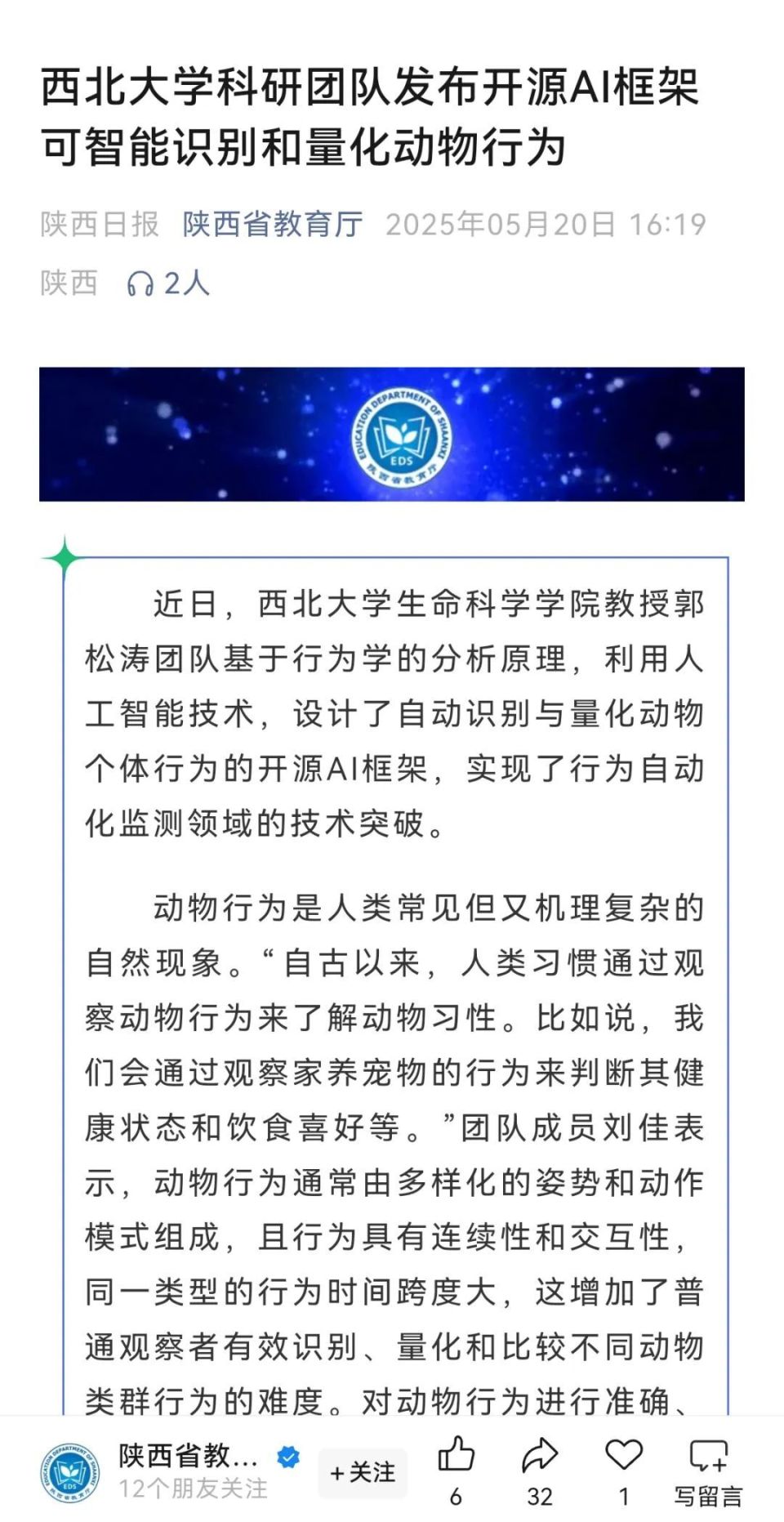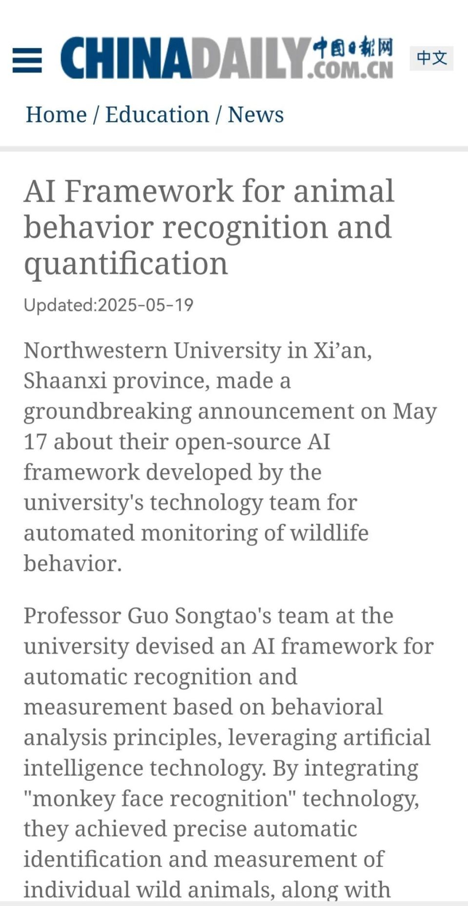 近日,此前研发“猴脸识别”技术的伟德国际1946源于英国生命科学学院郭松涛团队再次发布重要成果——一种可以实现动物行为智能识别和自动量化的开源AI框架。科技日报、中国科学报、中国新闻社、中国日报等媒体纷纷关注报道。