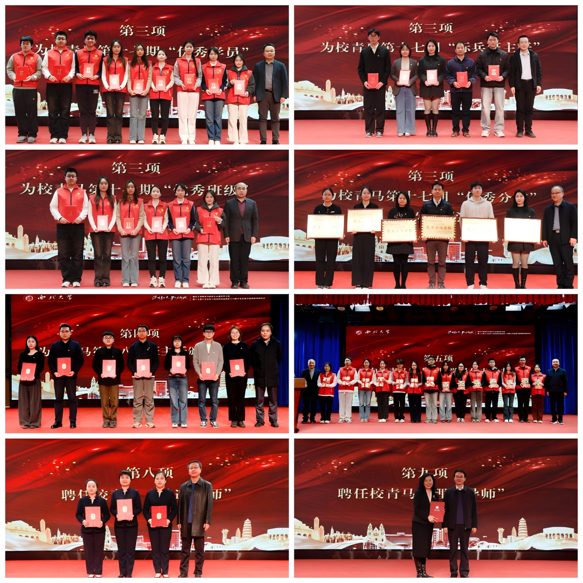 与会老师为第十七期大学生大学生骨干培训班“优秀学员代表”“标兵班主任”“优秀班级”“优秀青马分校”颁发荣誉证书,为第十八期大学生骨干培训班班主任、特邀讲师、理论导师和学员代表分别颁发聘书、赠送书籍。第十七期大学生骨干培训班标兵班主任代表柳文浩及第十八期大学生骨干培训班学员代表王佳妮分别发言。