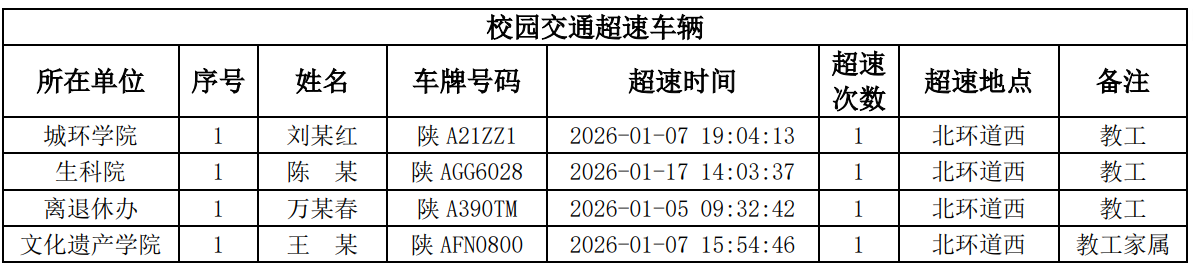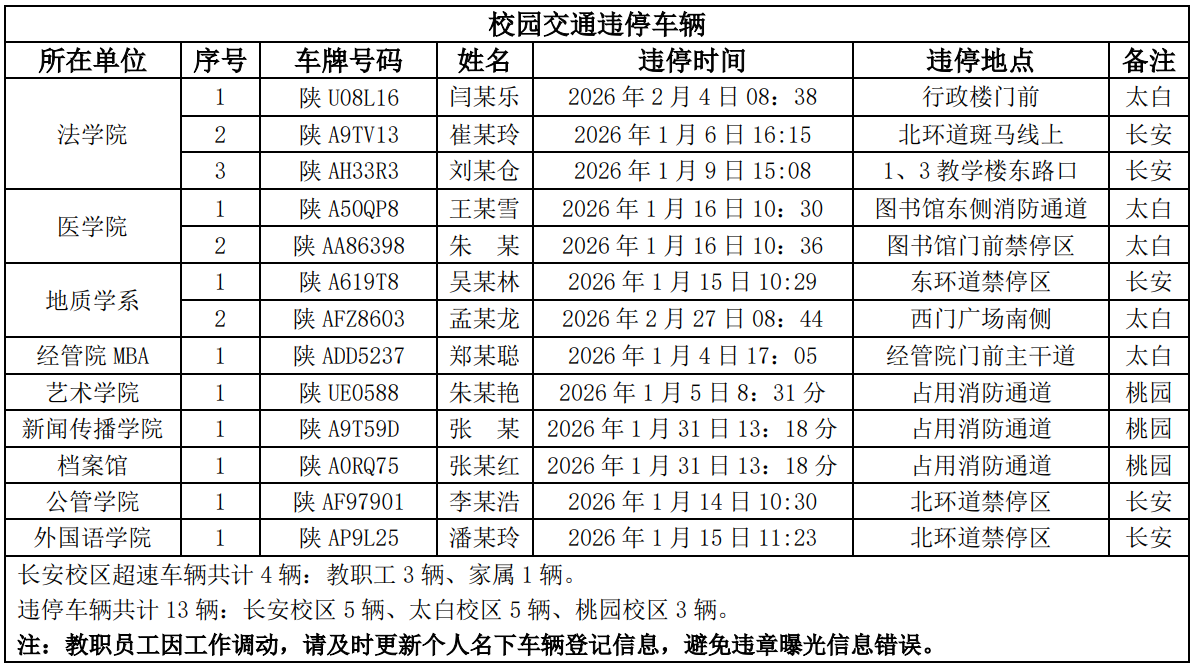 为进一步加强校园交通管理,保障校园交通安全有序,维护学校正常的教学、科研和生活秩序,切实保护师生员工的人身财产安全,根据《伟德国际1946源于英国校园交通安全管理规定》的相关要求,现将2026年1-2月校园交通违章车辆予以曝光,具体要求与违章信息如下: