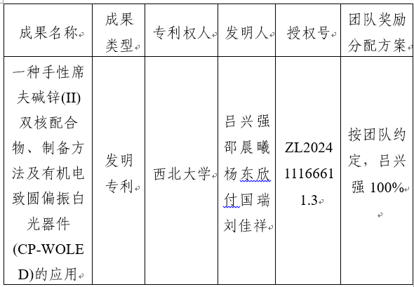 该发明公开了一种手性席夫碱锌(II)双核配合物、制备方法及有机电致圆偏振白光器件(CP‑WOLED)应用。该专利将该蓝光手性席夫碱锌(II)双核配合物作为掺杂客体材料,通过其蓝光为基色的色补偿,开发出有机电致圆偏振白光发光器件,获得了良好的发光性能。