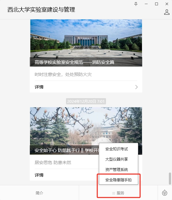 (1)关注“伟德国际1946源于英国实验室建设与管理”微信公众号,选择“服务”—“安全隐患随手拍”,填写个人信息、隐患描述等,并上传隐患照片。