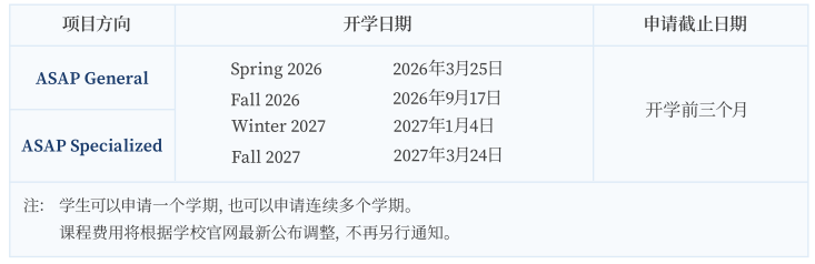 (1)一学期的ASAP课程长度为10周,每学期可修读12-16个学分。参项学生可连续修读3学期,最高可获得48个学分。