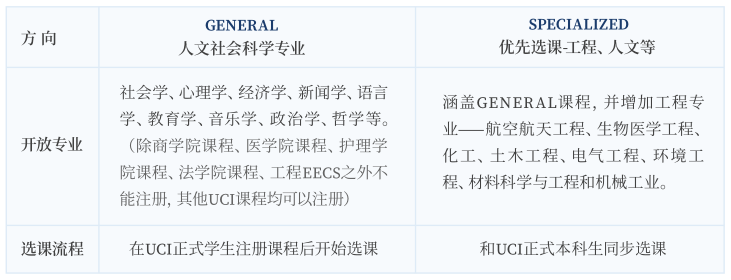 ASAP项目根据专业分设两个不同的方向——General和Specialized方向,开放几乎所有UCI课程,覆盖工程、公共卫生、计算机科学、经济学、心理学、社会学、国际关系等学科,学生可跨学科选修课程。