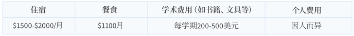 建议学生每学期预算约21000美元,以下仅供参考。