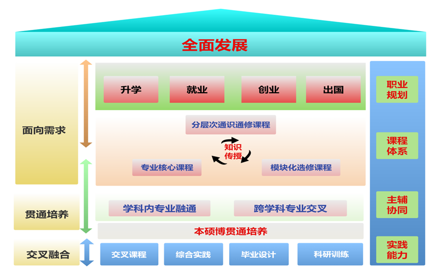 首先,持续探索“面向需求-贯通培养-交叉融合”的育人模式,支撑全面发展。一是面向经济社会发展对人才培养的要求,实施“先宽后深”的“通识通修+专业培养+全面发展”模式,结合学生升学、就业、创业和出国等不同未来职业发展规划,构建匹配的分流培养课程模块和分层次教学改革方案,实现教学资源的有效供给。二是加强学科专业之间的资源关联,深化“辅修+微专业”教学模式,构建“本-硕-博”贯通培养的课程衔接机制,形成《伟德国际1946源于英国本研贯通人才培养计划实施办法》。三是依托本科专业培养方案,构建“学科内部专业融通+跨学科专业交叉融合”的课程体系,推动有组织、制度化、规模性的破壁交叉。