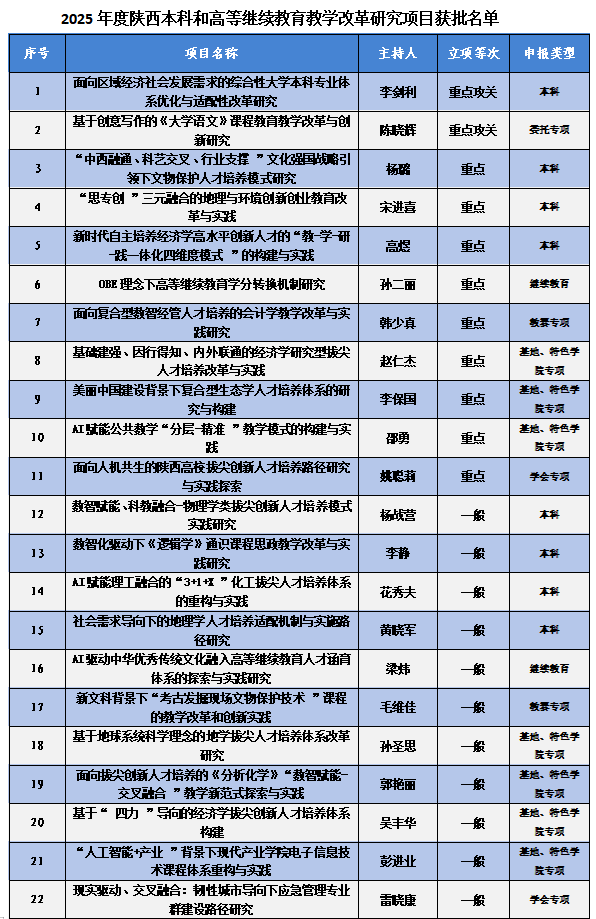 近日,陕西省教育厅公布了2025年度陕西本科和高等继续教育教学改革研究项目立项结果,伟德官网22个项目入选。