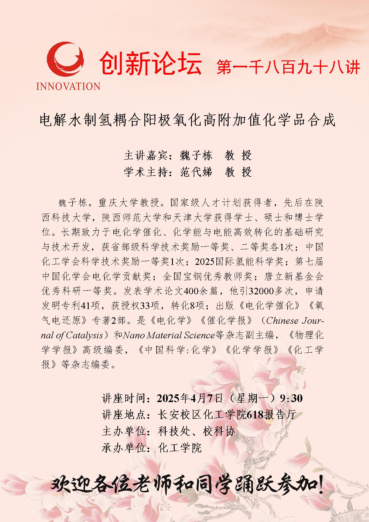 魏子栋 教授 伟德国际1946源于英国创新论坛第一千八百九十八讲:电解水制氢耦合阳极氧化高附加值化学品合成 讲座时间 2025年4月7日(星期一)9:30 讲座地点 长安校区化工学院618报告厅 讲座人介绍 魏子栋 教授 讲座内容