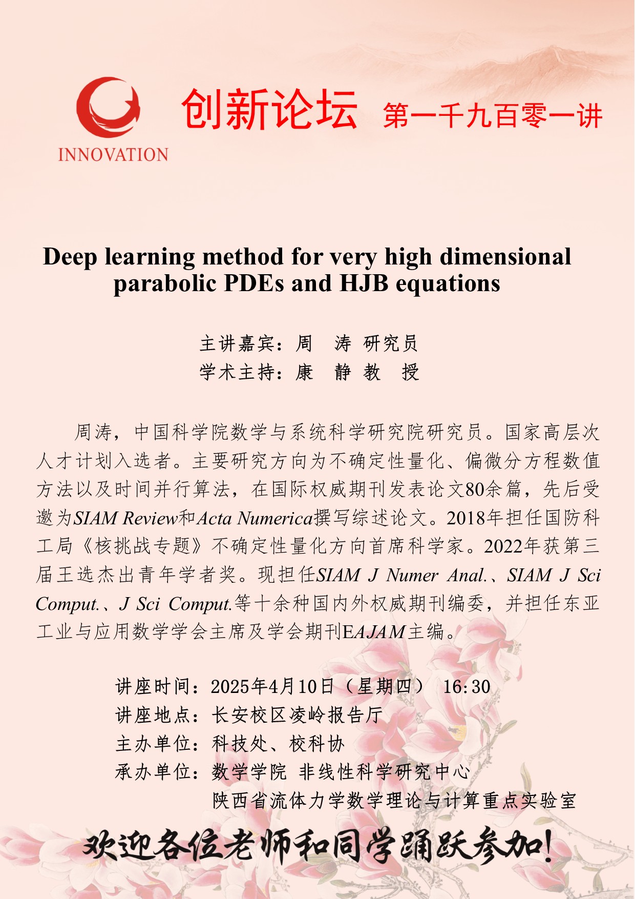 周涛 研究员 伟德国际1946源于英国创新论坛第一千九百零一讲:Deep learning method for very high dimensional parabolic PDEs and HJB equations 讲座时间 2025年4月10日(星期四) 16:30 讲座地点 长安校区凌岭报告厅 讲座人介绍 周涛 研究员 讲座内容