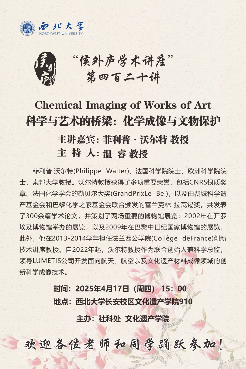 菲利普·沃尔特 教授 “侯外庐学术讲座”第四百二十讲:Chemical Imaging of Works of Art科学与艺术的桥梁:化学成像与文物保护 讲座时间 2025年4月17日(周四)15:00 讲座地点 伟德国际1946源于英国长安校区文化遗产学院910 讲座人介绍 菲利普·沃尔特 教授 讲座内容