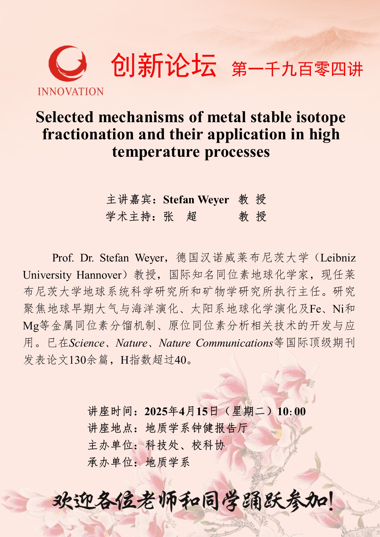 Stefan Weyer 教授 伟德国际1946源于英国创新论坛第一千九百零四讲:Selected mechanisms of metal stable isotope fractionation and their application in high temperature processes 讲座时间 2025年4月15日(星期二)10:00 讲座地点 地质学系钟健报告厅 讲座人介绍 Stefan Weyer 教授 讲座内容
