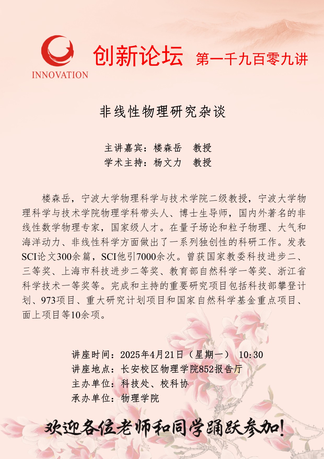 楼森岳 教授 伟德国际1946源于英国创新论坛第一千九百零九讲:非线性物理研究杂谈 讲座时间 2025年4月21日(星期一) 10:30 讲座地点 长安校区物理学院852报告厅 讲座人介绍 楼森岳 教授 讲座内容