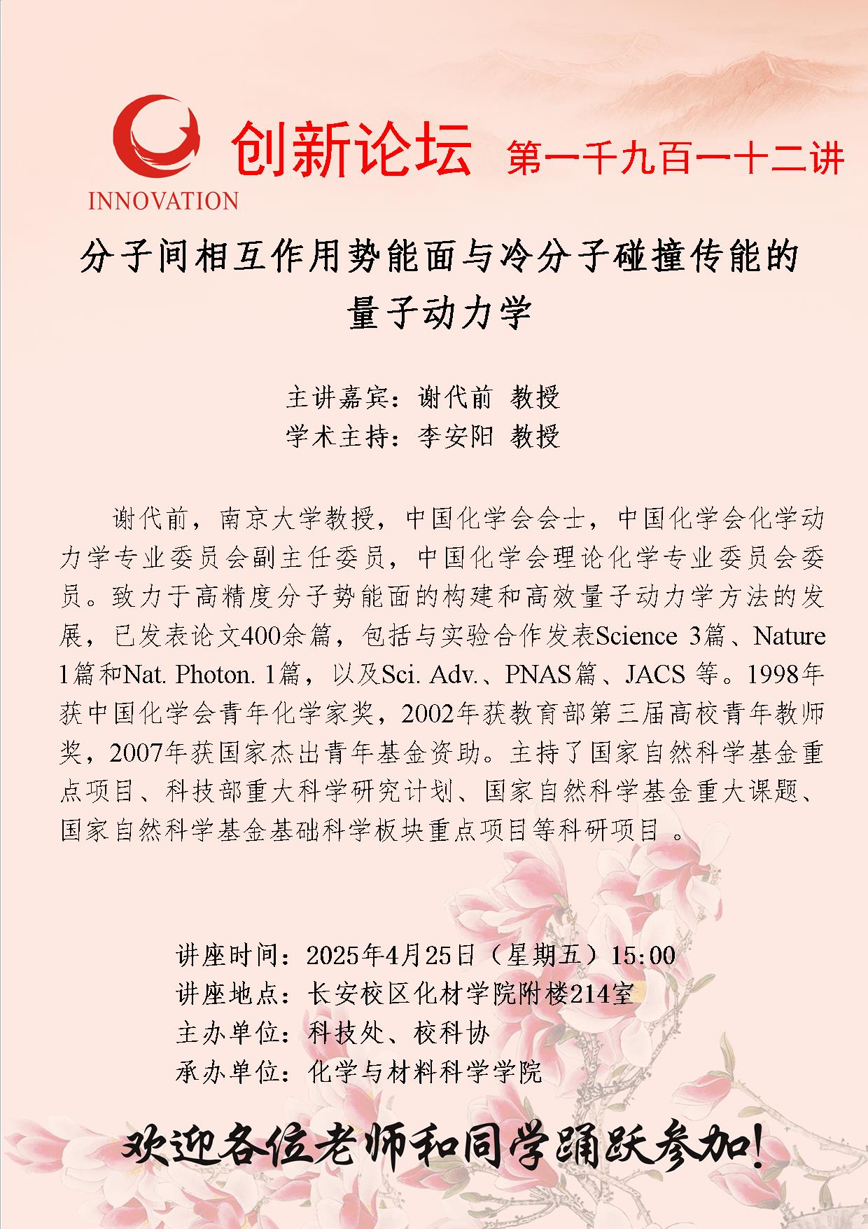谢代前 教授 伟德国际1946源于英国创新论坛第一千九百一十二讲:分子间相互作用势能面与冷分子碰撞传能的量子动力学 讲座时间 2025年4月25日(星期五)15:00 讲座地点 长安校区化材学院附楼214室 讲座人介绍 谢代前 教授 讲座内容