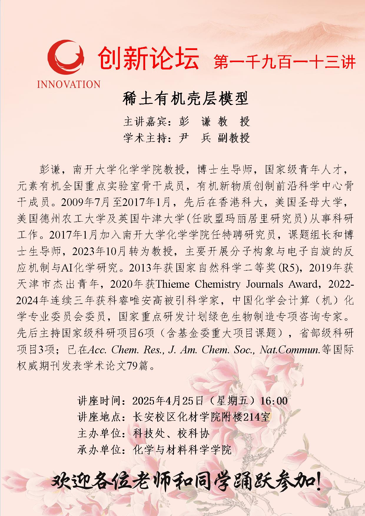 彭谦 教授 伟德国际1946源于英国创新论坛第一千九百一十三讲:稀土有机壳层模型 讲座时间 2025年4月25日(星期五)16:00 讲座地点 长安校区化材学院附楼214室 讲座人介绍 彭谦 教授 讲座内容