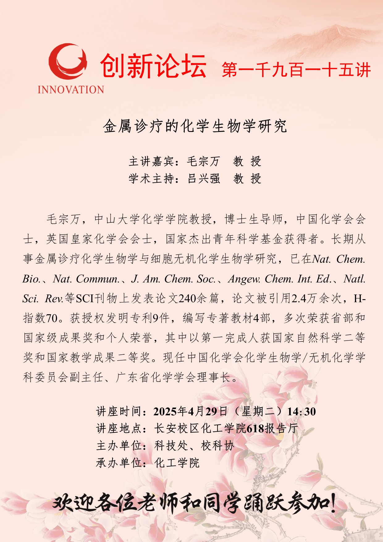 毛宗万 教授 伟德国际1946源于英国创新论坛第一千九百一十五讲:金属诊疗的化学生物学研究 讲座时间 2025年4月29日(星期二)14:30 讲座地点 长安校区化工学院618报告厅 讲座人介绍 毛宗万 教授 讲座内容