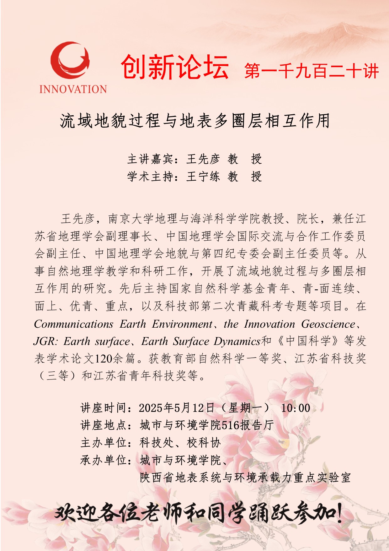 王先彦 教授 伟德国际1946源于英国创新论坛第一千九百二十讲:流域地貌过程与地表多圈层相互作用 讲座时间 2025年5月12日(星期一) 10:00 讲座地点 城市与环境学院516报告厅 讲座人介绍 王先彦 教授 讲座内容