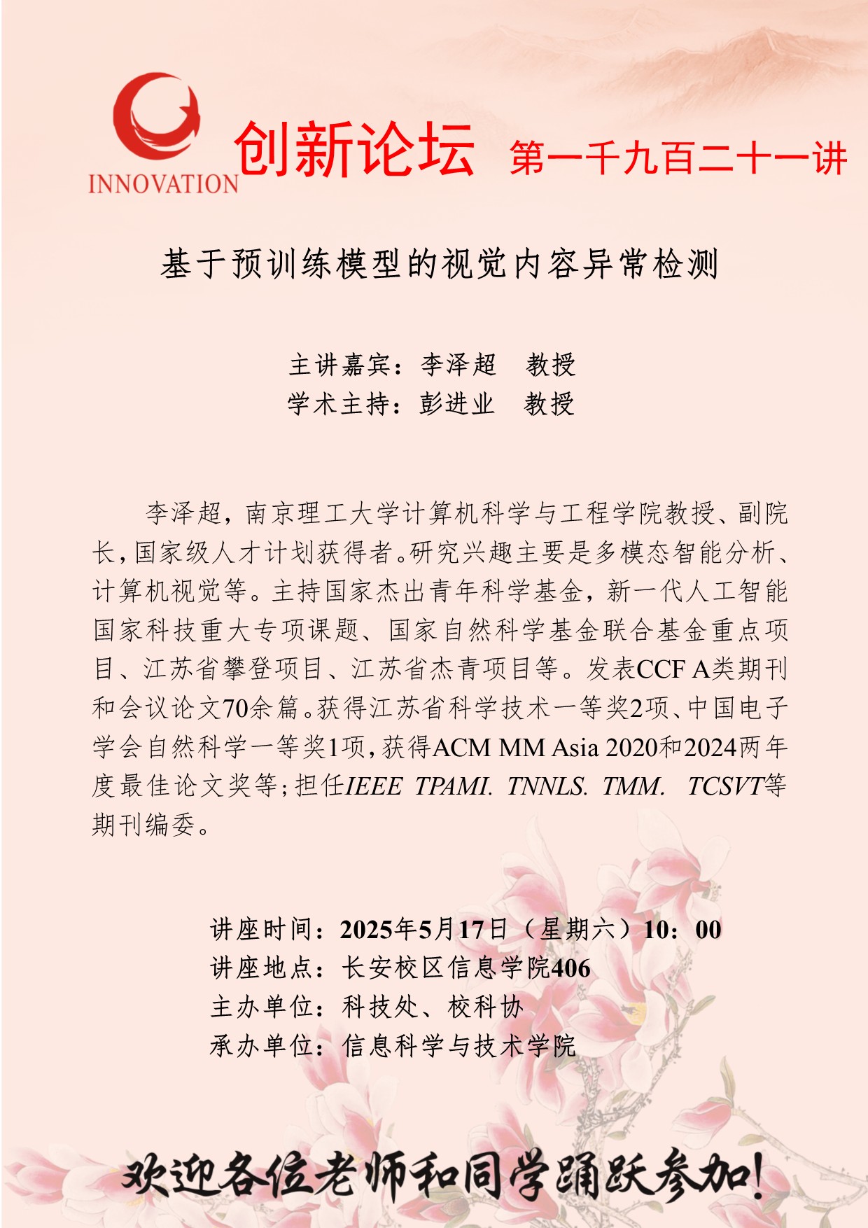 李泽超 教授 伟德国际1946源于英国创新论坛第一千九百二十一讲:基于预训练模型的视觉内容异常检测 讲座时间 2025年5月17日(星期六)10:00 讲座地点 长安校区信息学院406 讲座人介绍 李泽超 教授 讲座内容