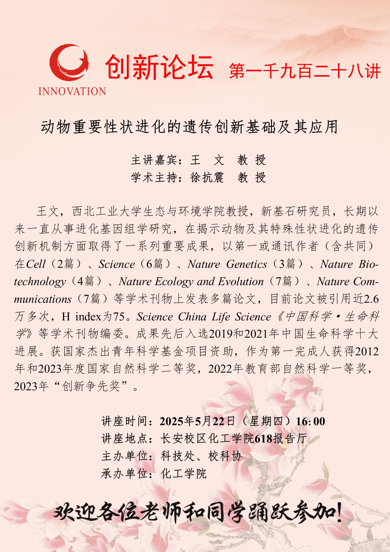 王文 教授 伟德国际1946源于英国创新论坛第一千九百二十八讲:动物重要性状进化的遗传创新基础及其应用 讲座时间 2025年5月22日(星期四)16:00 讲座地点 长安校区化工学院618报告厅 讲座人介绍 王文 教授 讲座内容