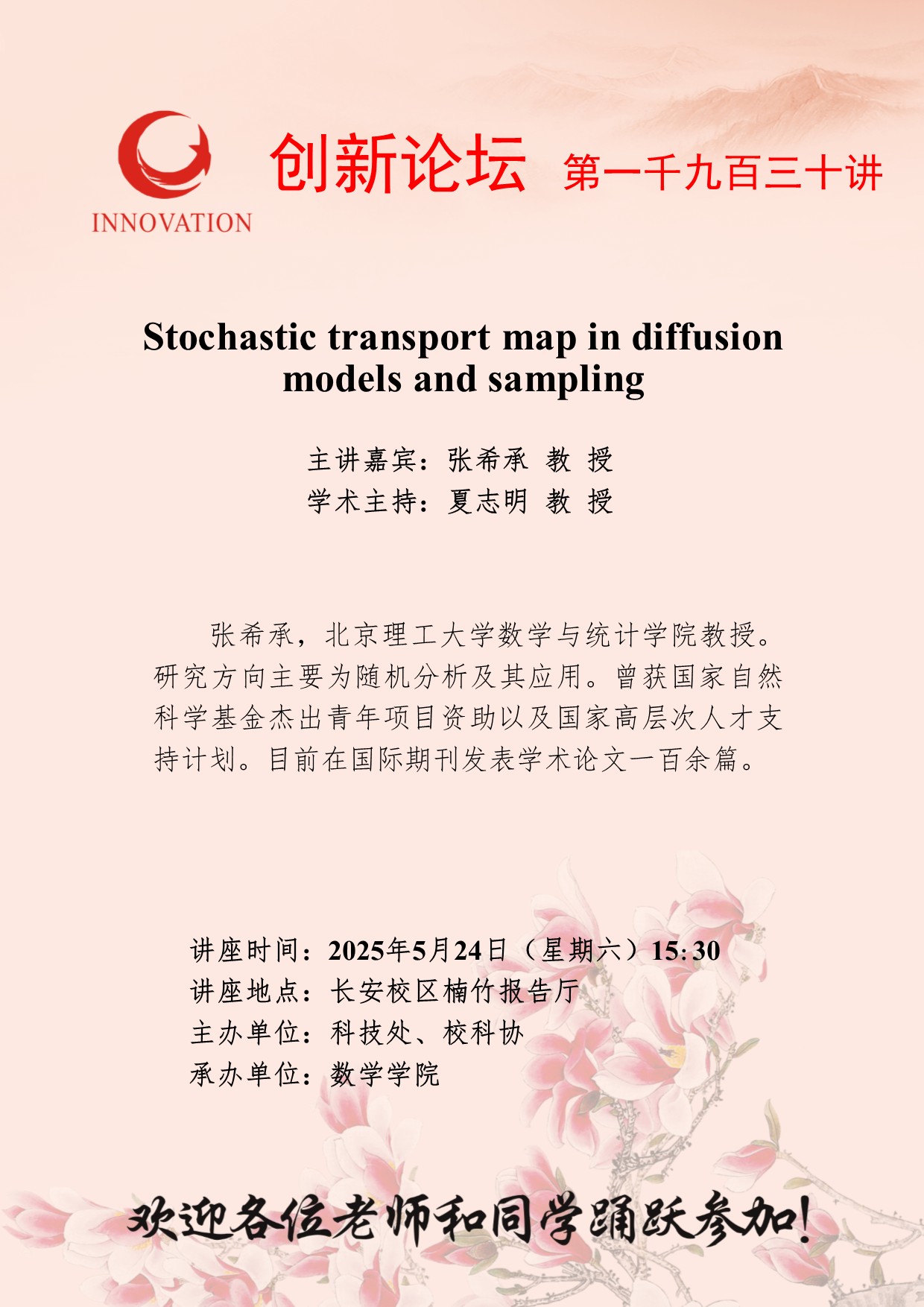 张希承 教授 伟德国际1946源于英国创新论坛第一千九百三十讲:Stochastic transport map in diffusion models and sampling 讲座时间 2025年5月24日(星期六)15:30 讲座地点 长安校区楠竹报告厅 讲座人介绍 张希承 教授 讲座内容