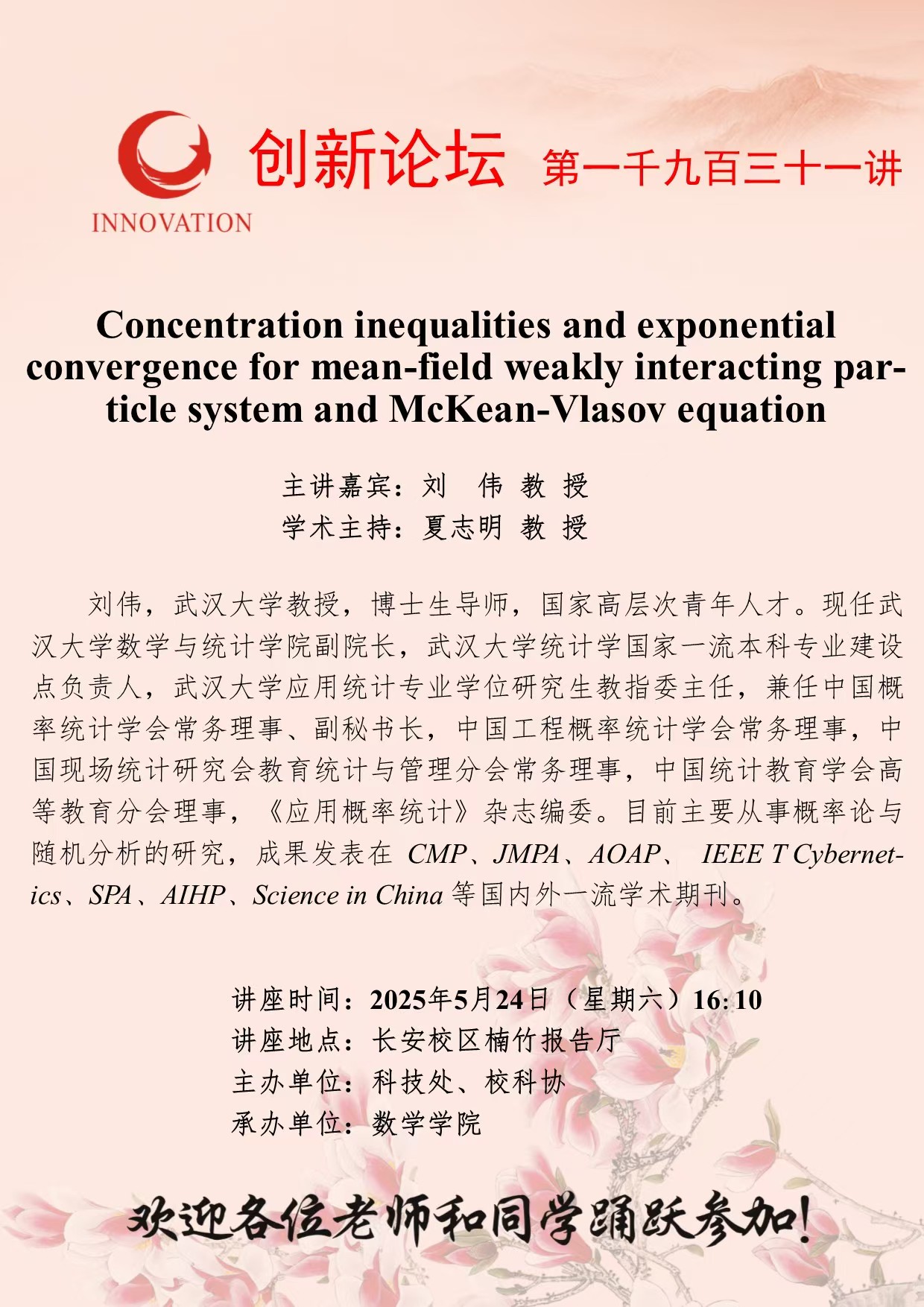 刘伟 教授 伟德国际1946源于英国创新论坛第一千九百三十一讲:Concentration inequalities and exponential convergence for mean-field weakly interacting particle system and McKean-Vlasov equation 讲座时间 2025年5月24日(星期六)16:10 讲座地点 长安校区楠竹报告厅 讲座人介绍 刘伟 教授 讲座内容