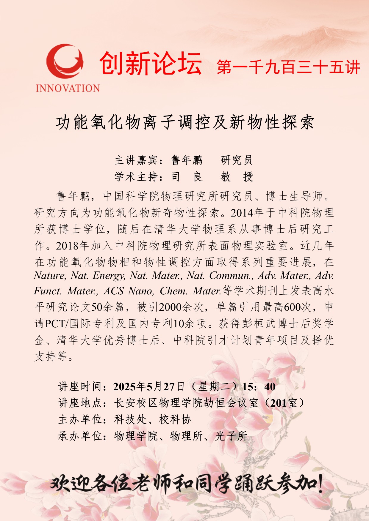 鲁年鹏 研究员 伟德国际1946源于英国创新论坛第一千九百三十五讲:功能氧化物离子调控及新物性探索 讲座时间 2025年5月27日(星期二)15:40 讲座地点 长安校区物理学院劼恒会议室(201室) 讲座人介绍 鲁年鹏 研究员 讲座内容