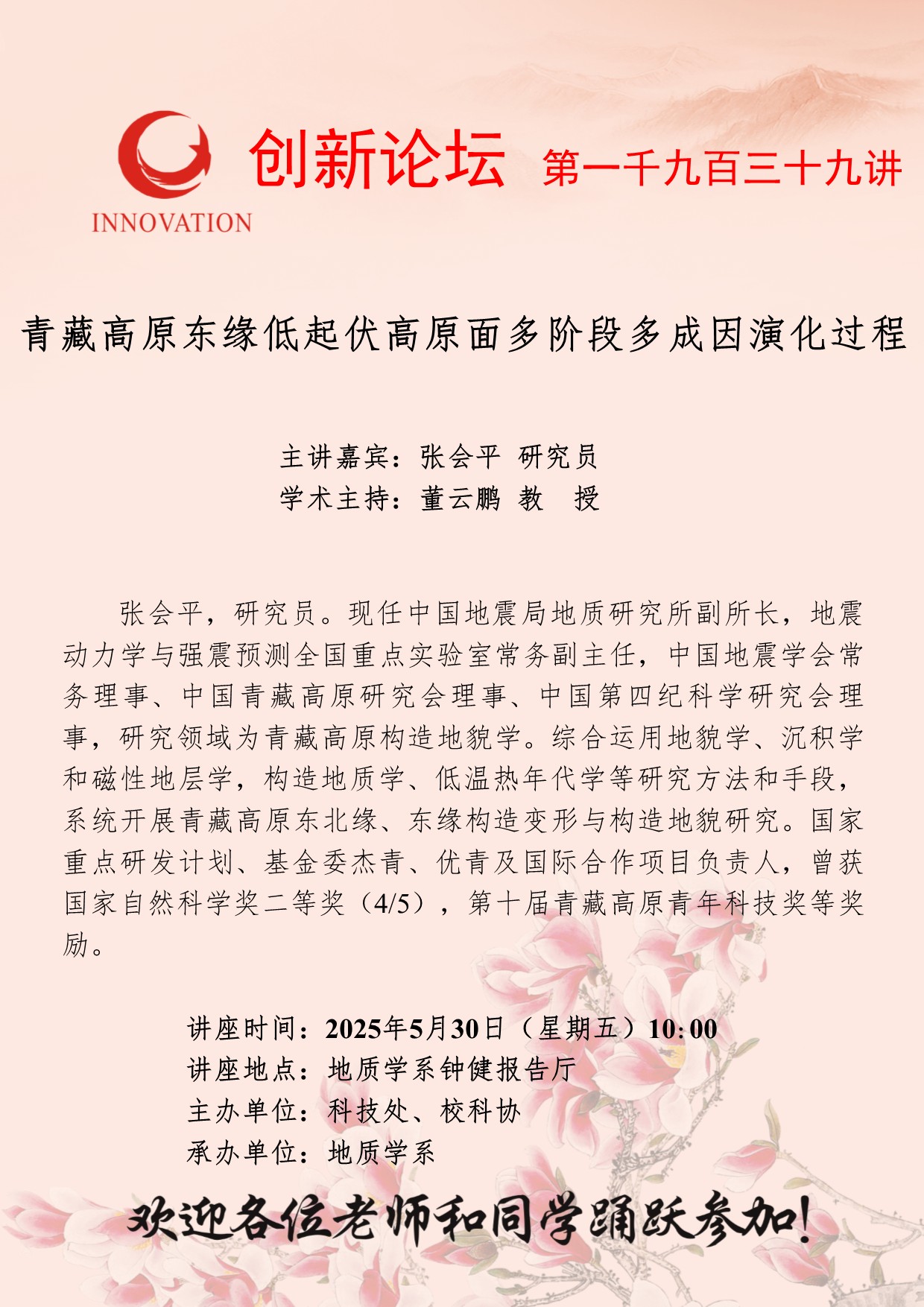 张会平 研究员 伟德国际1946源于英国创新论坛第一千九百三十九讲:青藏高原东缘低起伏高原面多阶段多成因演化过程 讲座时间 2025年5月30日(星期五)10:00 讲座地点 地质学系钟健报告厅 讲座人介绍 张会平 研究员 讲座内容
