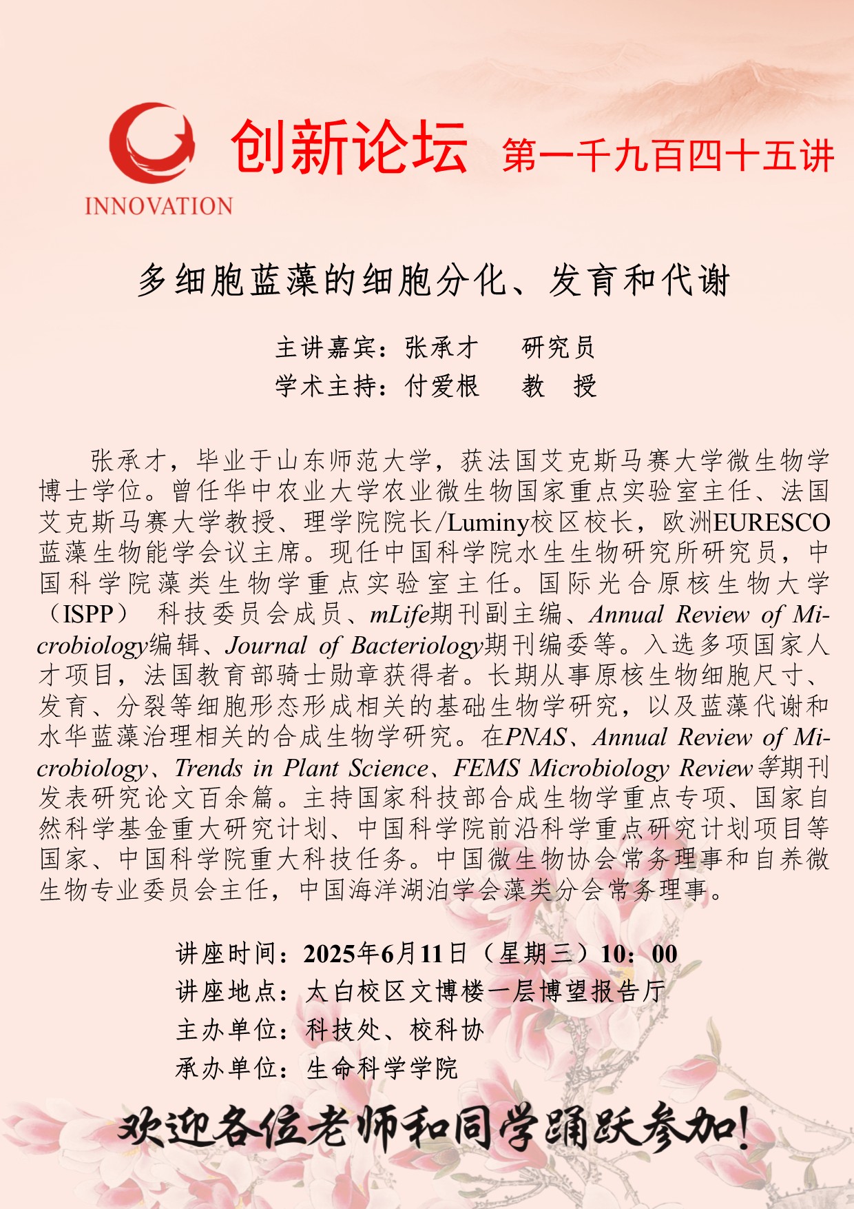 张承才 研究员 伟德国际1946源于英国创新论坛第一千九百四十五讲:多细胞蓝藻的细胞分化、发育和代谢 讲座时间 2025年6月11日(星期三)10:00 讲座地点 太白校区文博楼一层博望报告厅 讲座人介绍 张承才 研究员 讲座内容