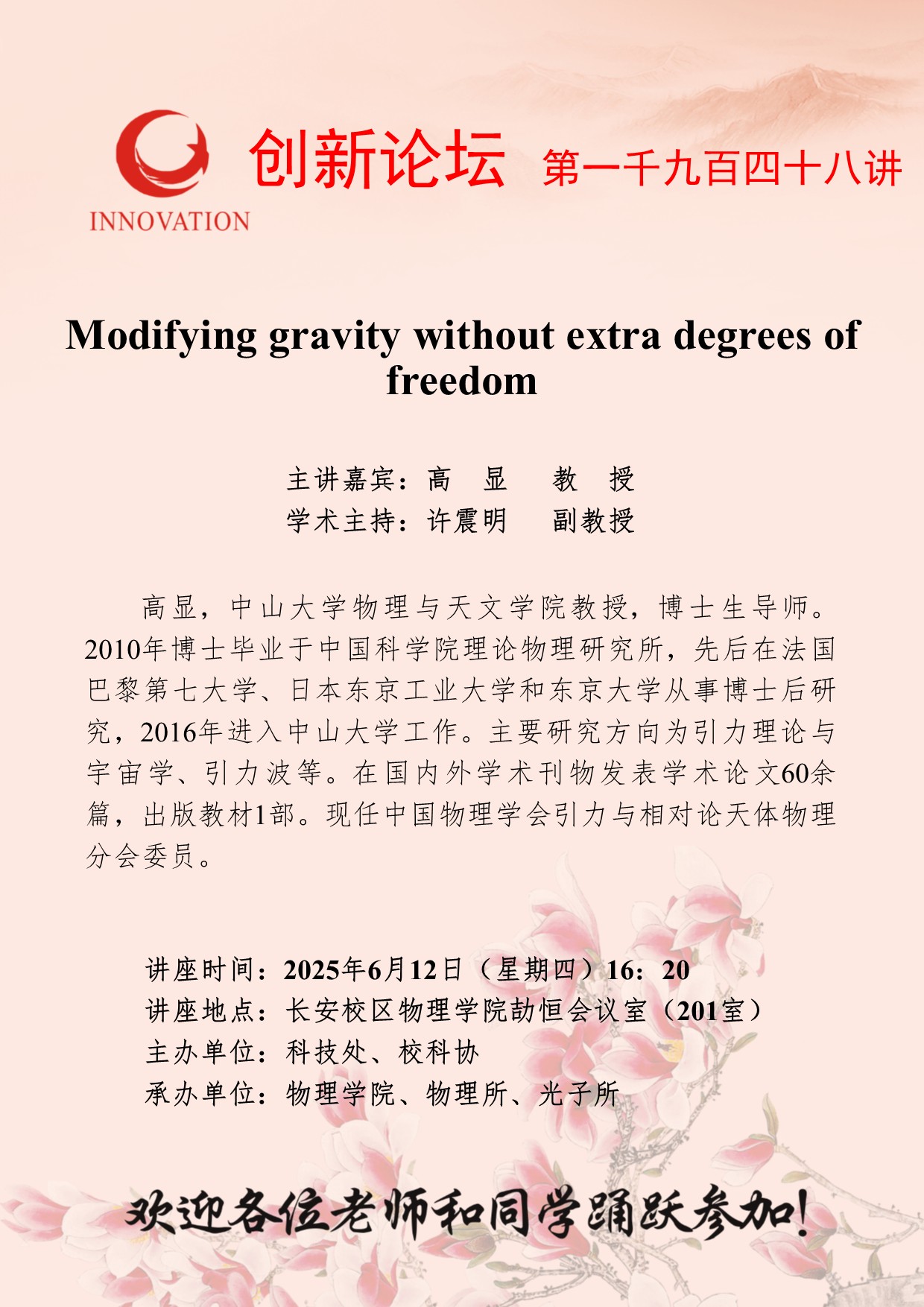 高显 教授 伟德国际1946源于英国创新论坛第一千九百四十八讲:Modifying gravity without extra degrees of freedom 讲座时间 2025年6月12日(星期四)16:20 讲座地点 长安校区物理学院劼恒会议室(201室) 讲座人介绍 高显 教授 讲座内容