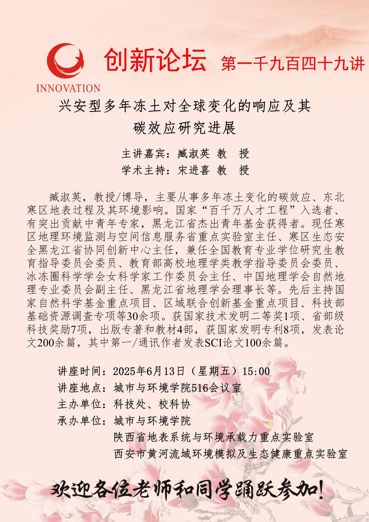 臧淑英 教授 伟德国际1946源于英国创新论坛第一千九百四十九讲:兴安型多年冻土对全球变化的响应及其碳效应研究进展 讲座时间 2025年6月13日(星期五)15:00 讲座地点 城市与环境学院516会议室 讲座人介绍 臧淑英 教授 讲座内容