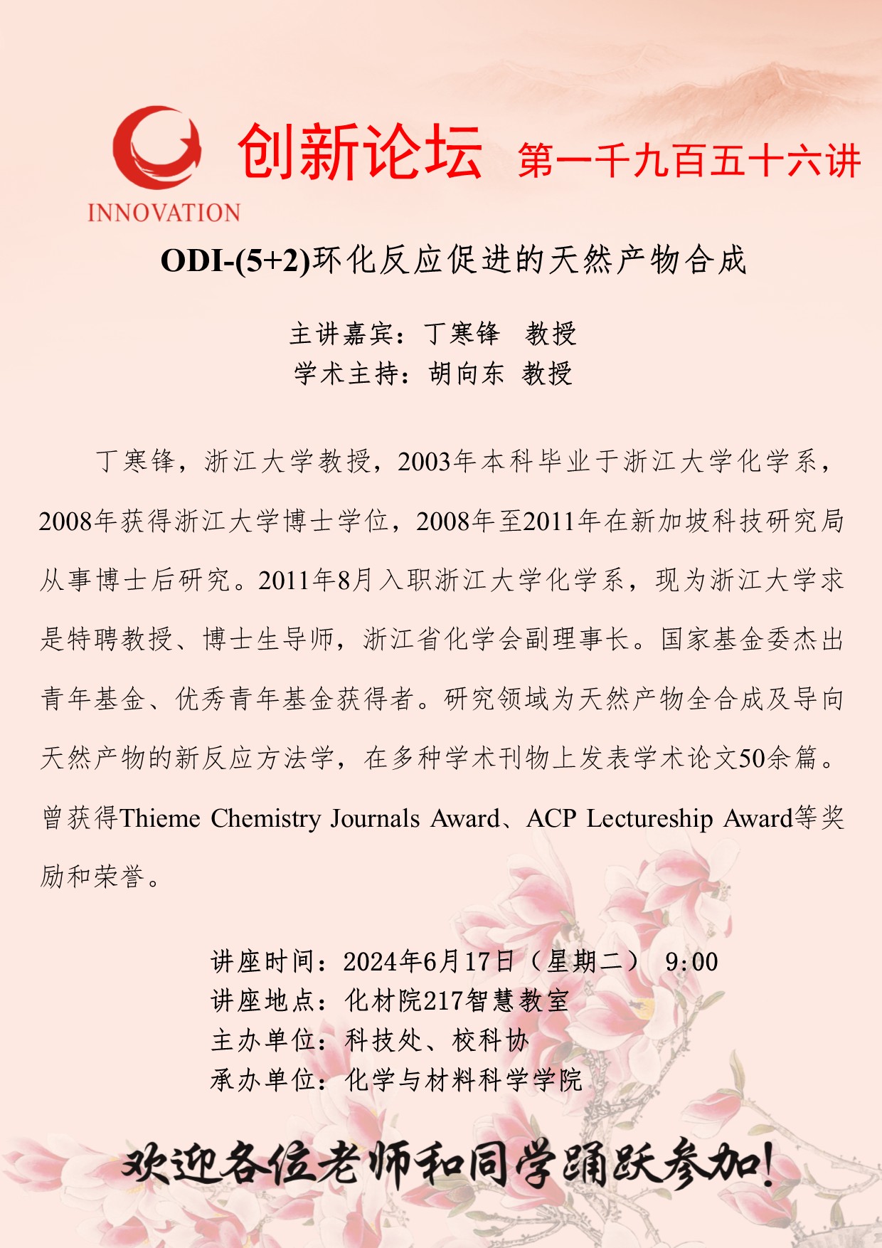 丁寒锋 教授 伟德国际1946源于英国创新论坛第一千九百五十六讲:ODI-(5+2)环化反应促进的天然产物合成 讲座时间 2024年6月17日(星期二) 9:00 讲座地点 化材院217智慧教室 讲座人介绍 丁寒锋 教授 讲座内容