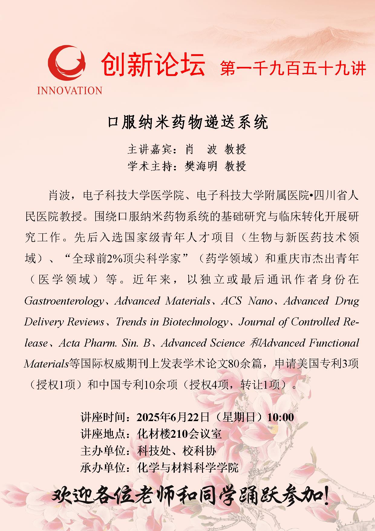 肖波 教授 伟德国际1946源于英国创新论坛第一千九百五十九讲: 口服纳米药物递送系统 讲座时间 2025年6月22日(星期日)10:00 讲座地点 化材楼210会议室 讲座人介绍 肖波 教授 讲座内容