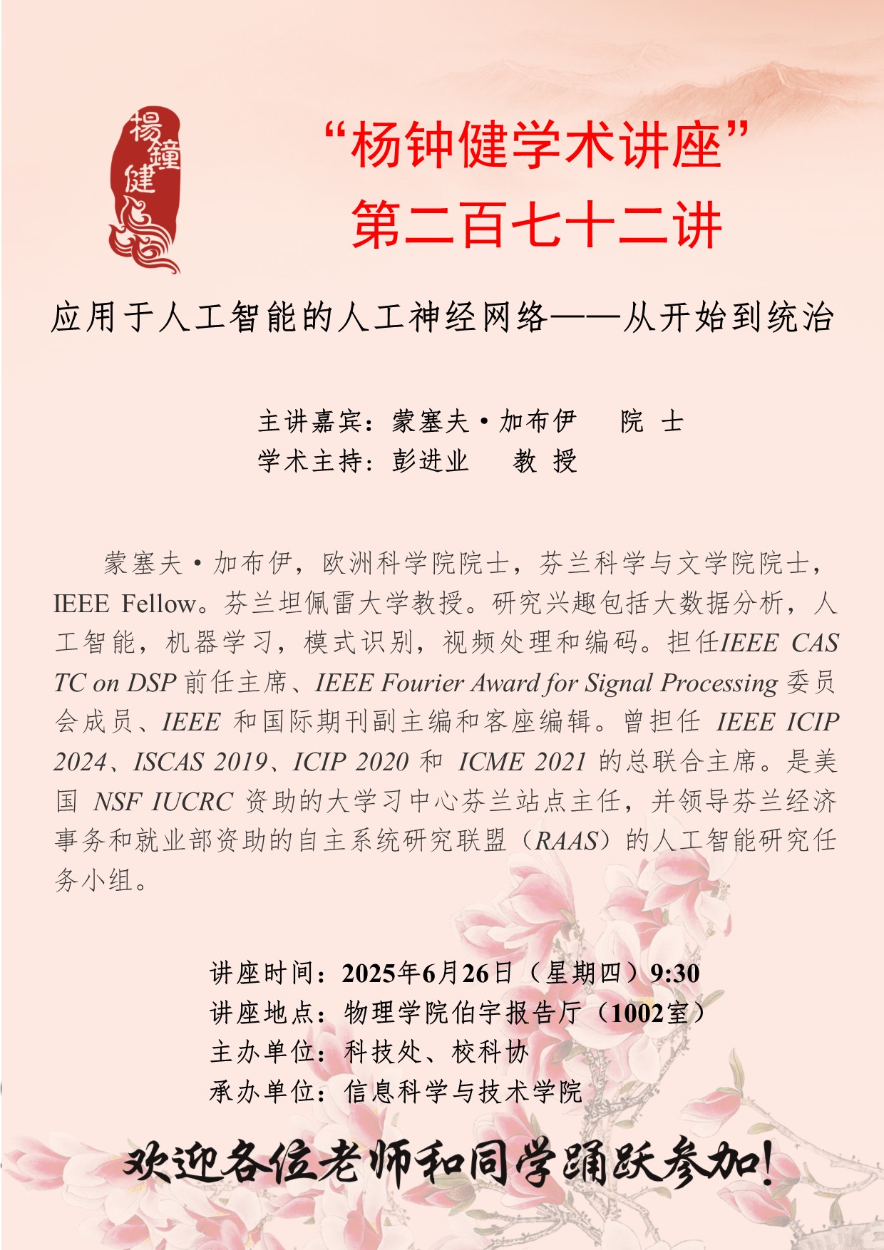 蒙塞夫·加布伊 院士 “杨钟健学术讲座”第二百七十二讲:应用于人工智能的人工神经网络——从开始到统治 讲座时间 2025年6月26日(星期四)9:30 讲座地点 物理学院伯宇报告厅(1002室) 讲座人介绍 蒙塞夫·加布伊 院士 讲座内容