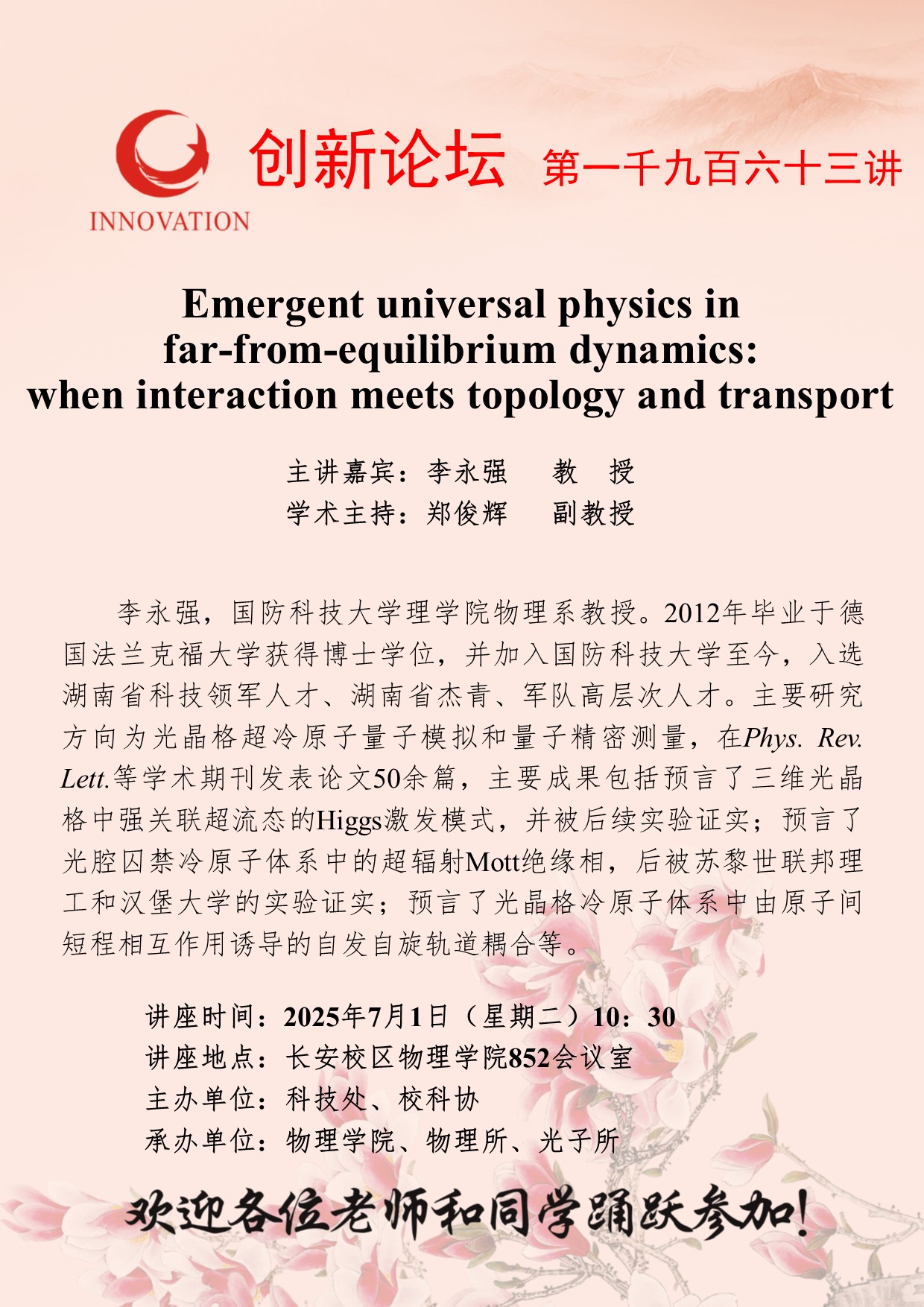 李永强 教授 伟德国际1946源于英国创新论坛第一千九百六十三讲:Emergent universal physics in far-from-equilibrium dynamics: when interaction meets topology and transport 讲座时间 2025年7月1日(星期二)10:30 讲座地点 长安校区物理学院852会议室 讲座人介绍 李永强 教授 讲座内容