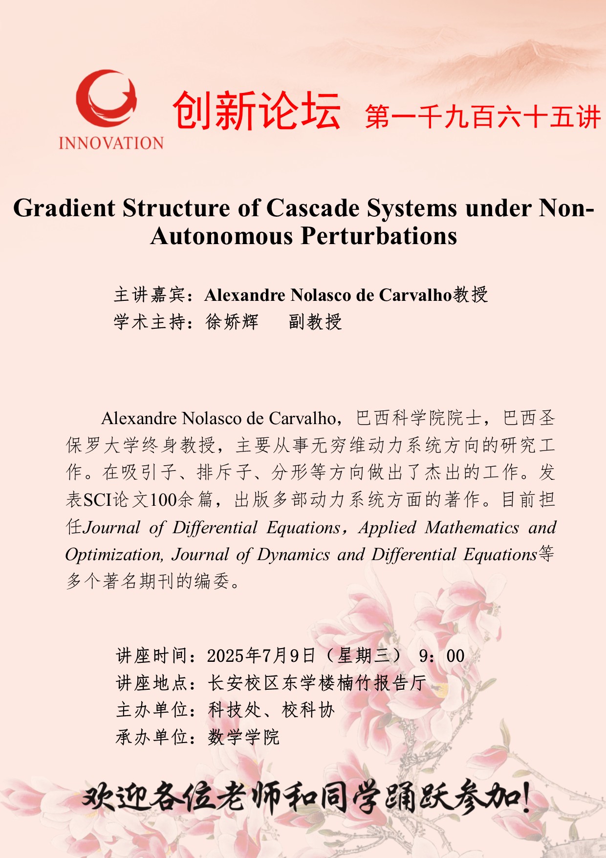 Alexandre Nolasco de Carvalho 教授 伟德国际1946源于英国创新论坛第一千九百六十五讲:Gradient Structure of Cascade Systems under Non-Autonomous Perturbations 讲座时间 2025年7月9日(星期三) 9:00 讲座地点 长安校区东学楼楠竹报告厅 讲座人介绍 Alexandre Nolasco de Carvalho 教授 讲座内容