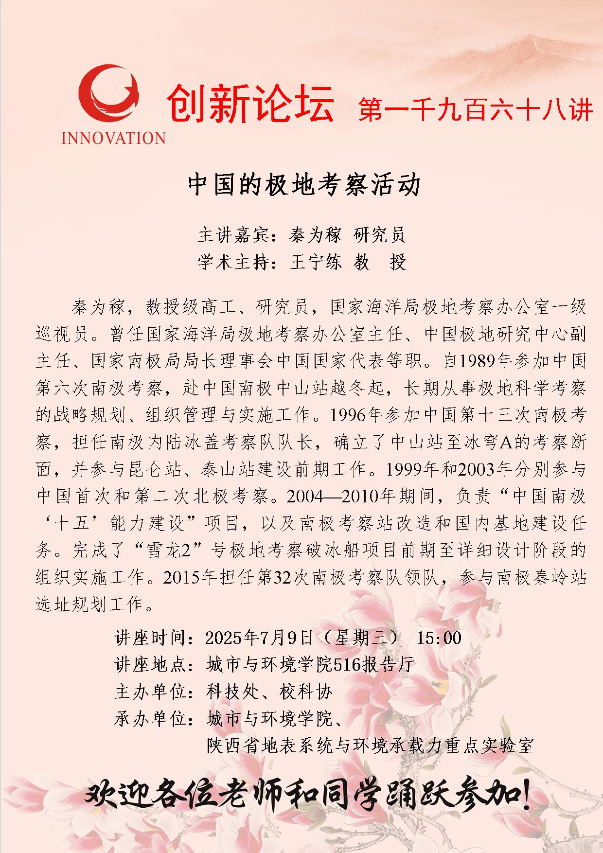 秦为稼 研究员 伟德国际1946源于英国创新论坛第一千九百六十八讲:中国的极地考察活动 讲座时间 2025年7月9日(星期三) 15:00 讲座地点 城市与环境学院516报告厅 讲座人介绍 秦为稼 研究员 讲座内容