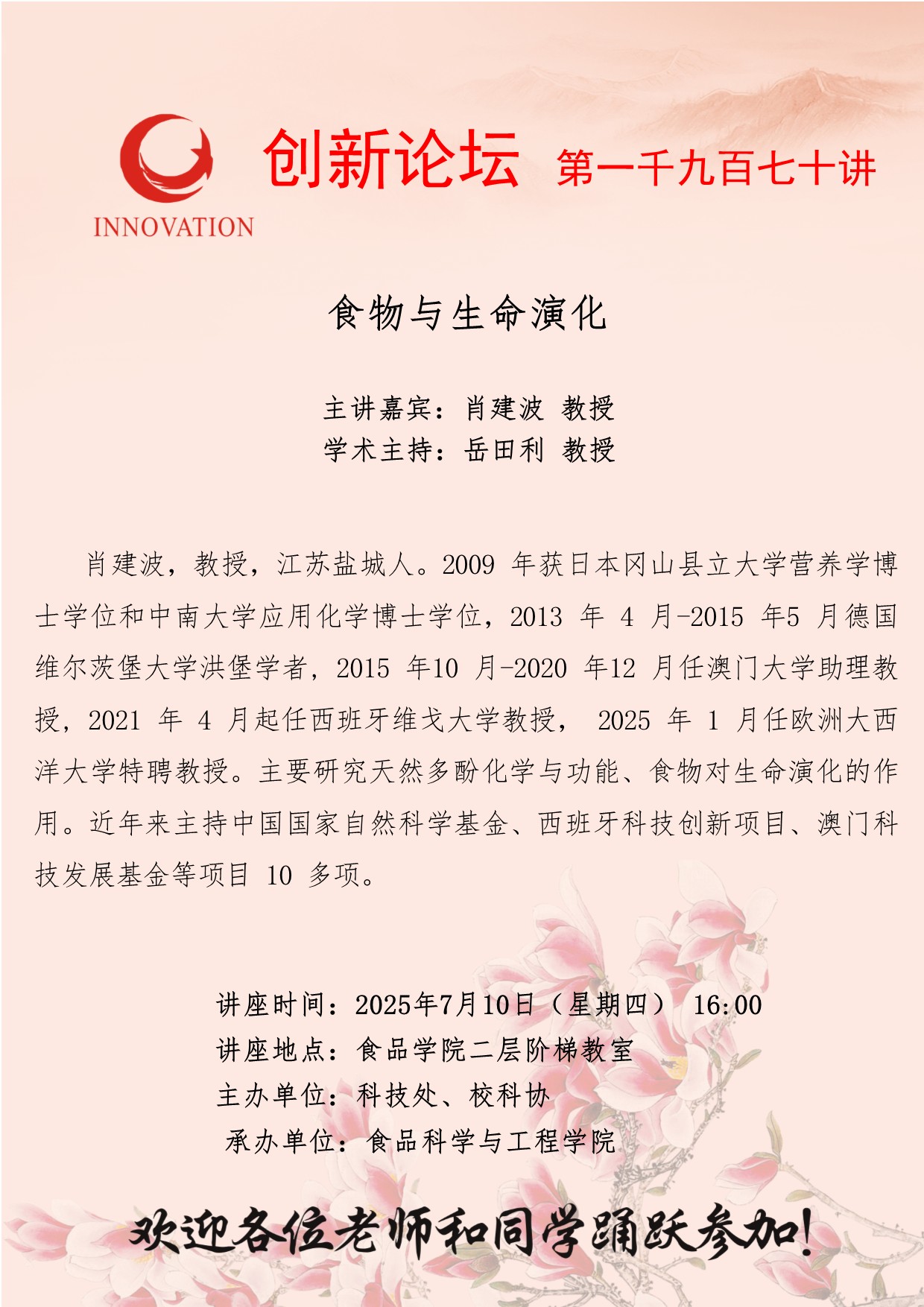 肖建波 教授 伟德国际1946源于英国创新论坛第一千九百七十讲: 食物与生命演化 讲座时间 2025年7月10日(星期四) 16:00 讲座地点 食品学院二层阶梯教室 讲座人介绍 肖建波 教授 讲座内容