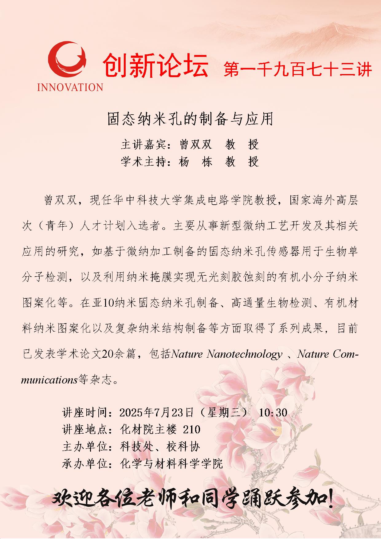 曾双双 教授 伟德国际1946源于英国创新论坛第一千九百七十三讲:固态纳米孔的制备与应用 讲座时间 2025年7月23日(星期三) 10:30 讲座地点 化材院主楼 210 讲座人介绍 曾双双 教授 讲座内容