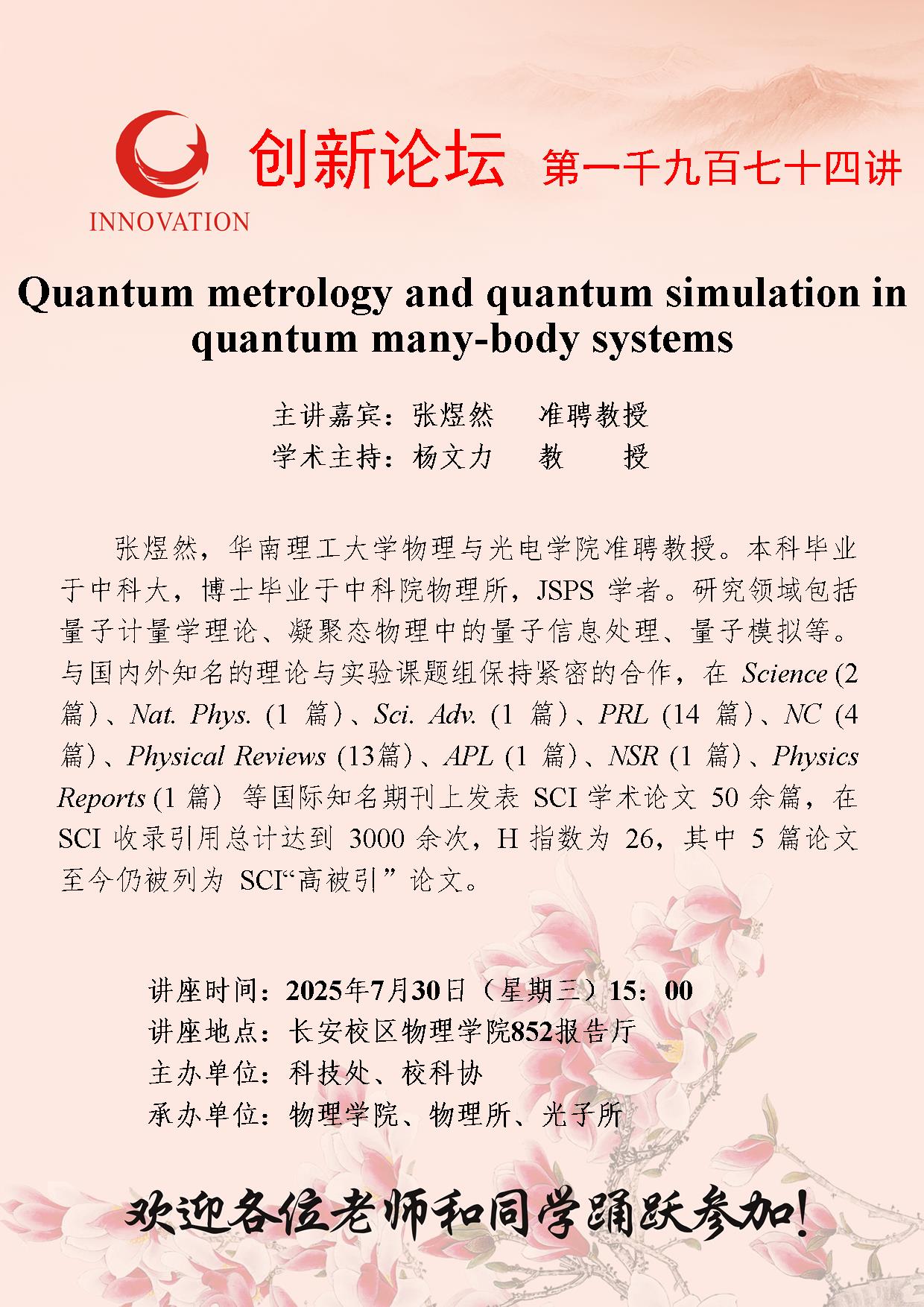 张煜然 准聘教授 伟德国际1946源于英国创新论坛第一千九百七十四讲:Quantum metrology and quantum simulation in quantum many-body systems 讲座时间 2025年7月30日(星期三)15:00 讲座地点 长安校区物理学院852报告厅 讲座人介绍 张煜然 准聘教授 讲座内容