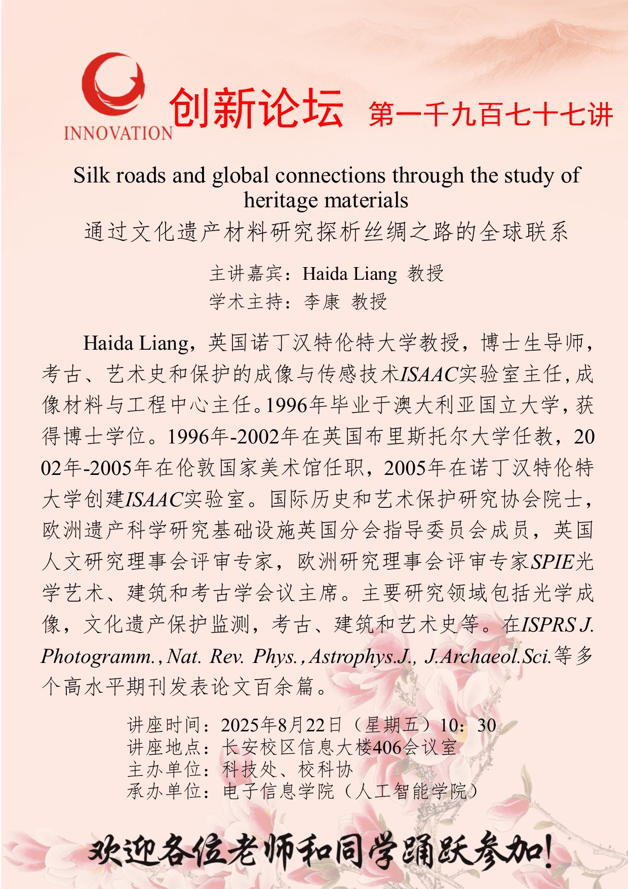 梁海达 教授 伟德国际1946源于英国创新论坛第一千九百七十七讲:Silk roads and global connections through the study of heritage materials 讲座时间 2025年8月22日(星期五)10:30 讲座地点 长安校区信息大楼406会议室 讲座人介绍 梁海达 教授 讲座内容