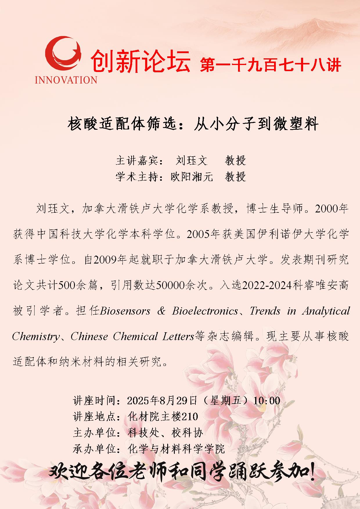 刘珏文 教授 伟德国际1946源于英国创新论坛第一千九百七十八讲:核酸适配体筛选:从小分子到微塑料 讲座时间 2025年8月29日(星期五)10:00 讲座地点 化材院主楼210 讲座人介绍 刘珏文 教授 讲座内容